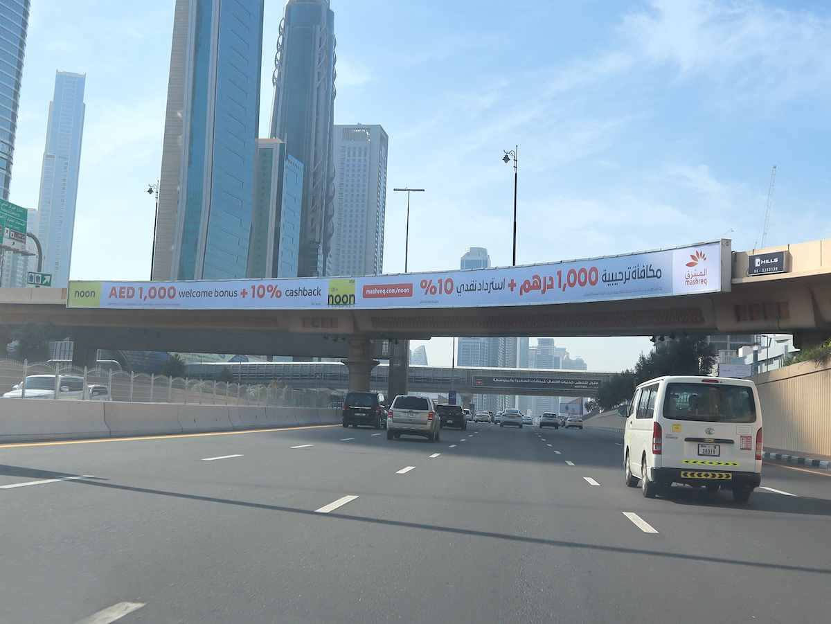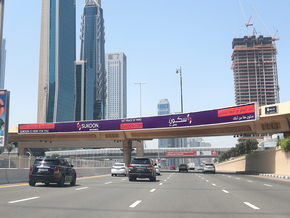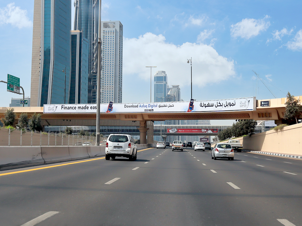 SZR 1st Interchange Face A – (Dubai towards Abu Dhabi) Visual Size 64.8M X 2.4M Estimated Cars 550,000 Type Backlit Bridge Direction DXB to AUH The 1st Interchange on Sheikh Zayed Road, it’s very close to Dubai Mall and the world famous Burj Khalifa Tower. It can be seen by all traffic Coming from Dubai and World Trade Centre toward Jebel Ali & Abu Dhabi.